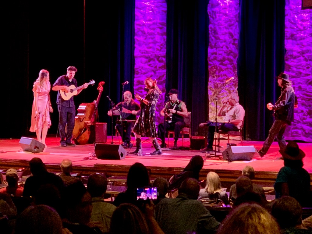 I’m not complaining; the festival organizers have limited control. I found the festival’s past open mics to have various challenges, such as no music stand, lousy lighting, no emcee, etc. At Palm Springs a few years ago, no power! The soundboard location was stage side, and the operator could not hear what the audience heard. Moreover, the soundboard did not provide a monitor for my bass/percussion track. For “The Galway Girl,” I could make out the drums but not the bassline or pennywhistle, though the audience heard everything.